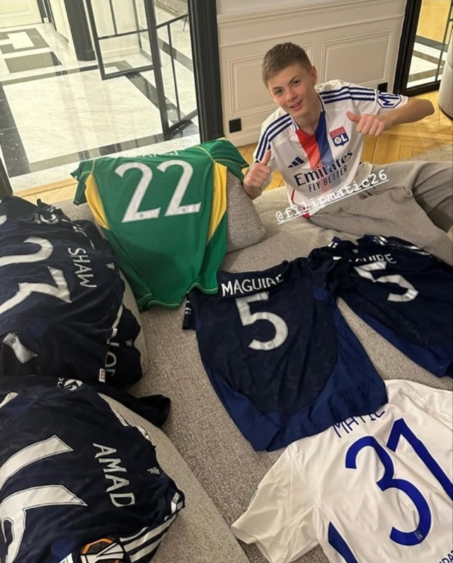 '마티치의 아들' 필립 마티치는 베테랑 센터백 해리 매과이어, 루크 쇼 등 맨유 선수들 유니폼을 앞에 두고 포즈를 취했다.