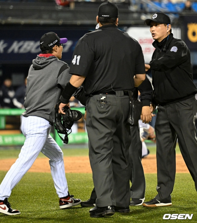 전날 잠실 두산전에서 염경엽 감독은 5회말 공격 당시 심판 판정에 항의해 퇴장 조치를 받았다. 5회말 1사 1루에서 이주헌의 타구가 3루로 향했고 두산 내야진이 2루, 1루로 볼을 돌리는 과정에서 1루 주자 문성주가 귀루했다. 1루에 문성주와 이주헌 두 명의 주자가 있게 됐고 두산 1루수 양석환이 LG 두 선수를 각각 태그했으나, 심판진은 문성주의 포스 아웃, 이주헌이 1루에 있는 2사 1루를 선언했다.