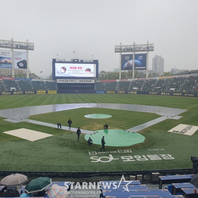 하지만 잠실은 달랐다. 오후 2시 25분경 방수포를 걷기 시작했고, 오후 2시 45분부터 양 팀 선수들은 그라운드로 나와 몸을 풀기 시작했다.