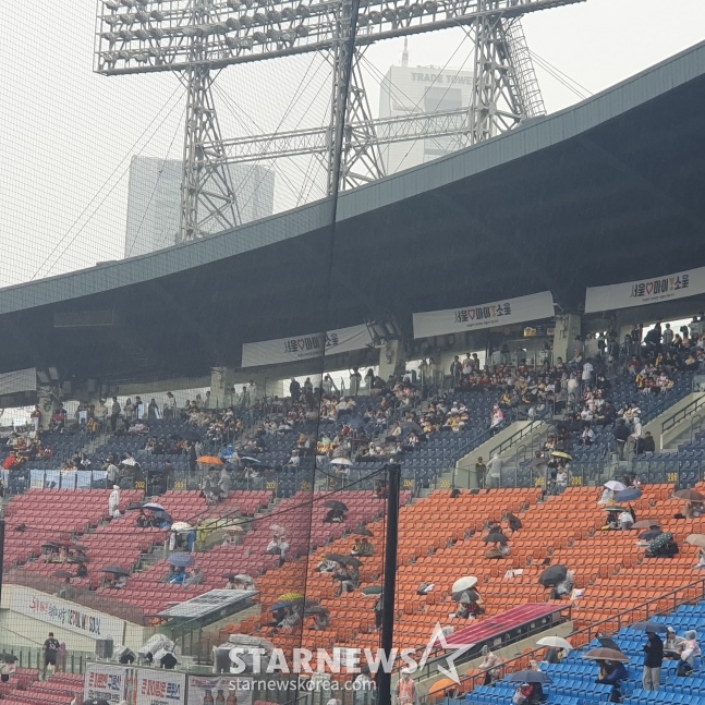 당초 이날 수도권에는 오후 늦게 비 소식이 예고돼 있었다. 그때그때 달라졌으나, 잠실야구장 근처에는 전반적으로 오후 3~4시 무렵 내린다는 예보였다. 하지만 12시 30분 무렵부터 급격히 하늘이 어두워지기 시작하더니, 1시 10분 무렵부터 비가 내리기 시작했다.