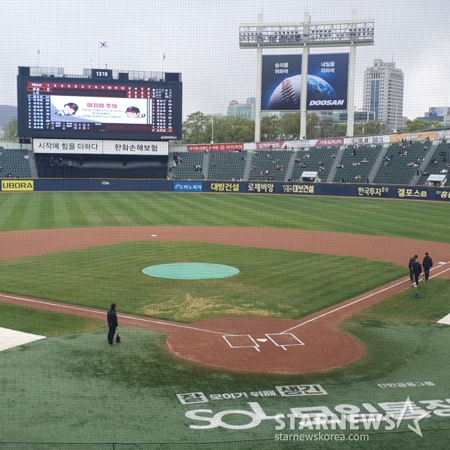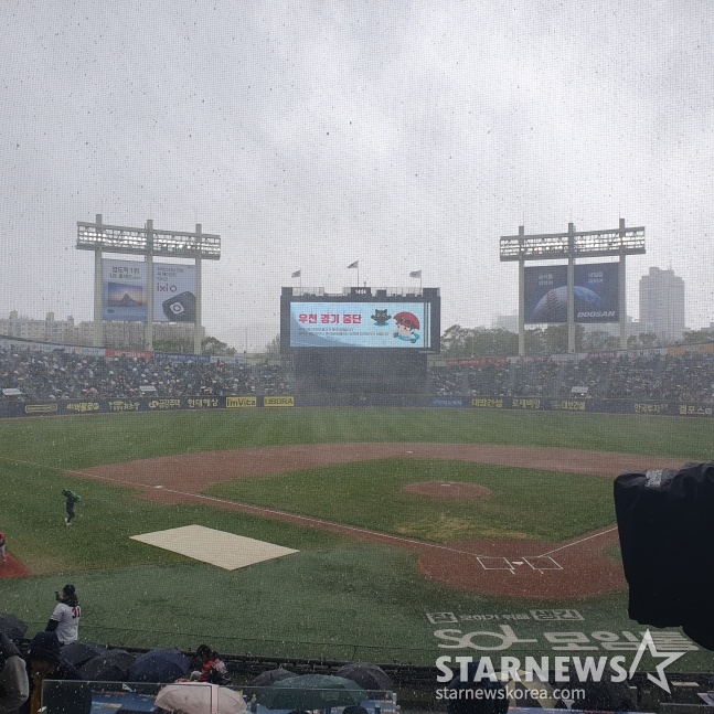 1회초 선두타자 정수빈이 손주영을 상대로 대형 2루타를 때렸다. 하지만 그와 동시에 갑자기 하늘에서 강한 바람과 함께 싸리눈이 쏟아졌다. 종잡을 수 없는 날씨에 심판진은 서둘러 선수들에게 손짓해 철수를 지시했고, 잠실야구장 관계자들은 방수포를 준비했다.