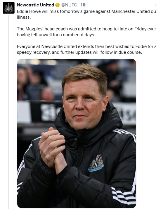 뉴캐슬은 13일(한국시간) 공식 채널을 통해 "하우 감독은 맨유전에 나서지 못한다. 며칠간 몸 상태가 좋지 않아 금요일 저녁 늦게 병원에 입원했다"며 "뉴캐슬 구성원은 하우 감독의 빠른 쾌유를 기원한다. 추후 자세한 소식을 알리겠다"고 발표했다.