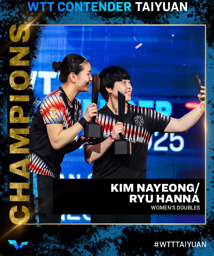 김나영-유한나는 13일(한국 시간) 중국 산시성의 타이위안에서 열린 천이-쉬이(중국) 조와의 '월드테이블테니스(WTT) 컨텐더 타이위안 2025' 여자복식 결승에서 3-2(11-9 4-11 11-5 4-11 11-6)로 승리했다.