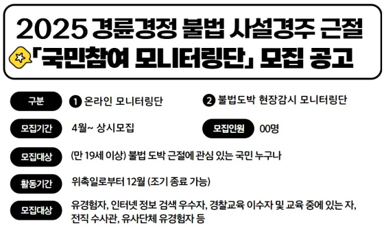 불법 사설 경주 근절로 국민의 피해를 최소화하고 공정하고 투명한 경주관람 문화를 조성하기 위해 운영하는 국민 참여 모니터링단은 올해는 규모를 더욱 확대하여 온라인 모니터링단은 25명 내외, 불법도박 현장감시 모니터링단은 55명 내외를 모집한다.