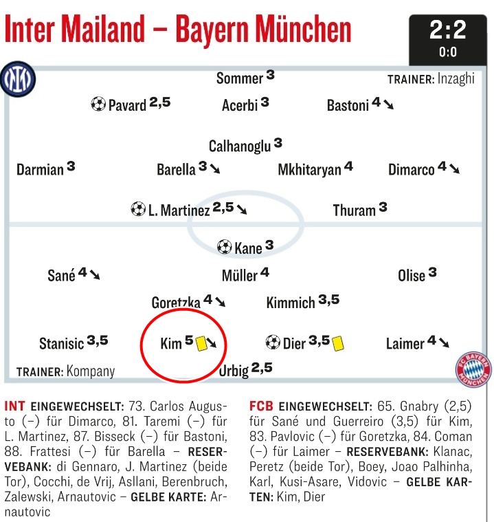 특히 후반 16분 김민재는 인터밀란의 코너킥 상황에서 벵자맹 파바르(30·인터밀란)와 헤딩 경합에서 완전히 밀렸다. 공은 파바르의 머리를 맞고 강하게 뮌헨 골문으로 빨려 들어갔다. 김민재는 실점 4분 뒤 교체됐다. 합계 2-4로 밀리던 뮌헨은 후반 31분 에릭 다이어(31)의 헤더로 한 골 따라붙었지만, 끝내 경기 결과를 뒤집지는 못했다.