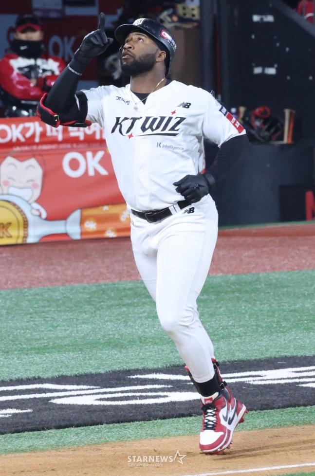 로하스 주니어와 KT 모두에게 반가운 홈런이었다. 2017년 KT에 입단해 2020년 리그 MVP를 받고 떠났던 로하스 주니어는 지난해 KBO 리그로 복귀했다. 복귀하자마자 32홈런 112타점으로 KT를 꼴찌에서 가을야구로 이끌었고 올해도 재계약에 성공하면서 어느덧 KBO 6시즌째를 맞이했다.