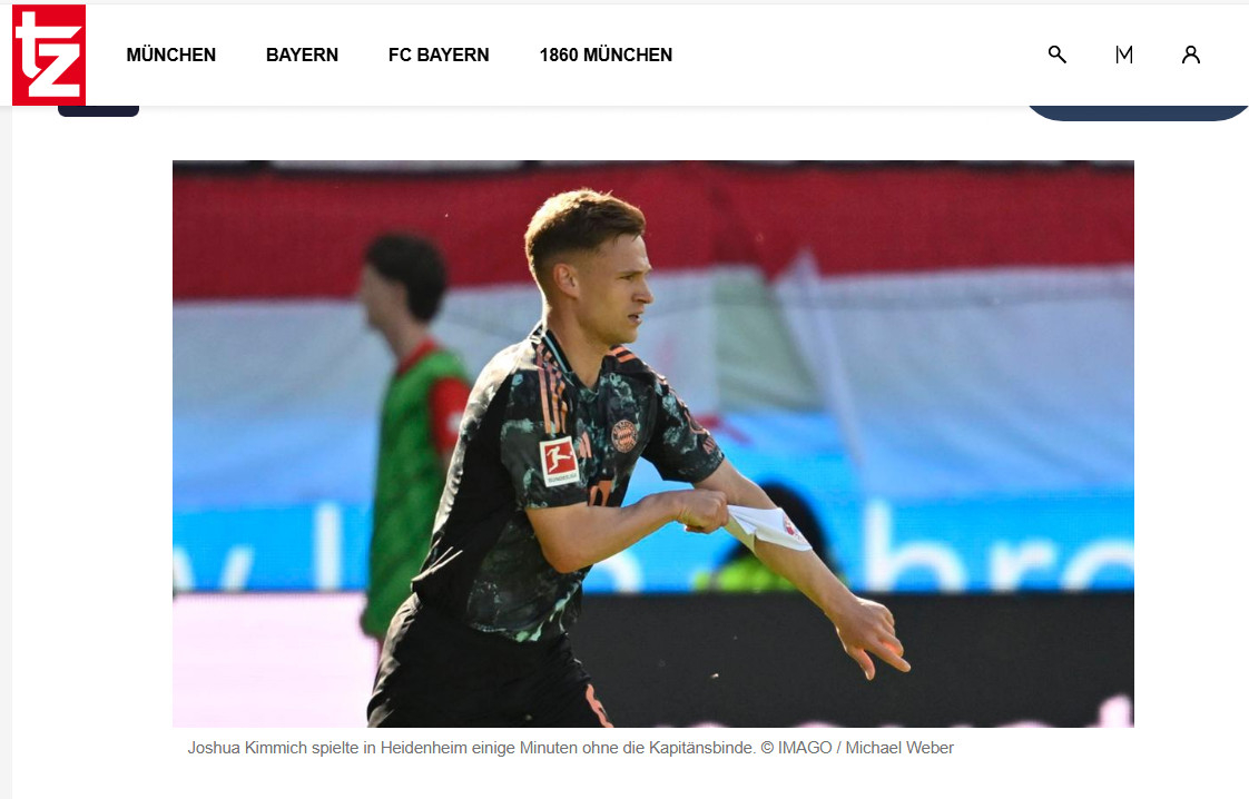 독일 TZ는 21일(한국시간) "뮌헨이 유럽축구연맹(UEFA) 챔피언스리그(UCL) 탈락에 대한 화풀이로 하이덴하임을 4-0으로 혼쭐냈는데 이날 키미히가 흥미로운 장면을 만들었다"며 "경기 도중 주장 완장이 사라진 것이다"라고 전했다.