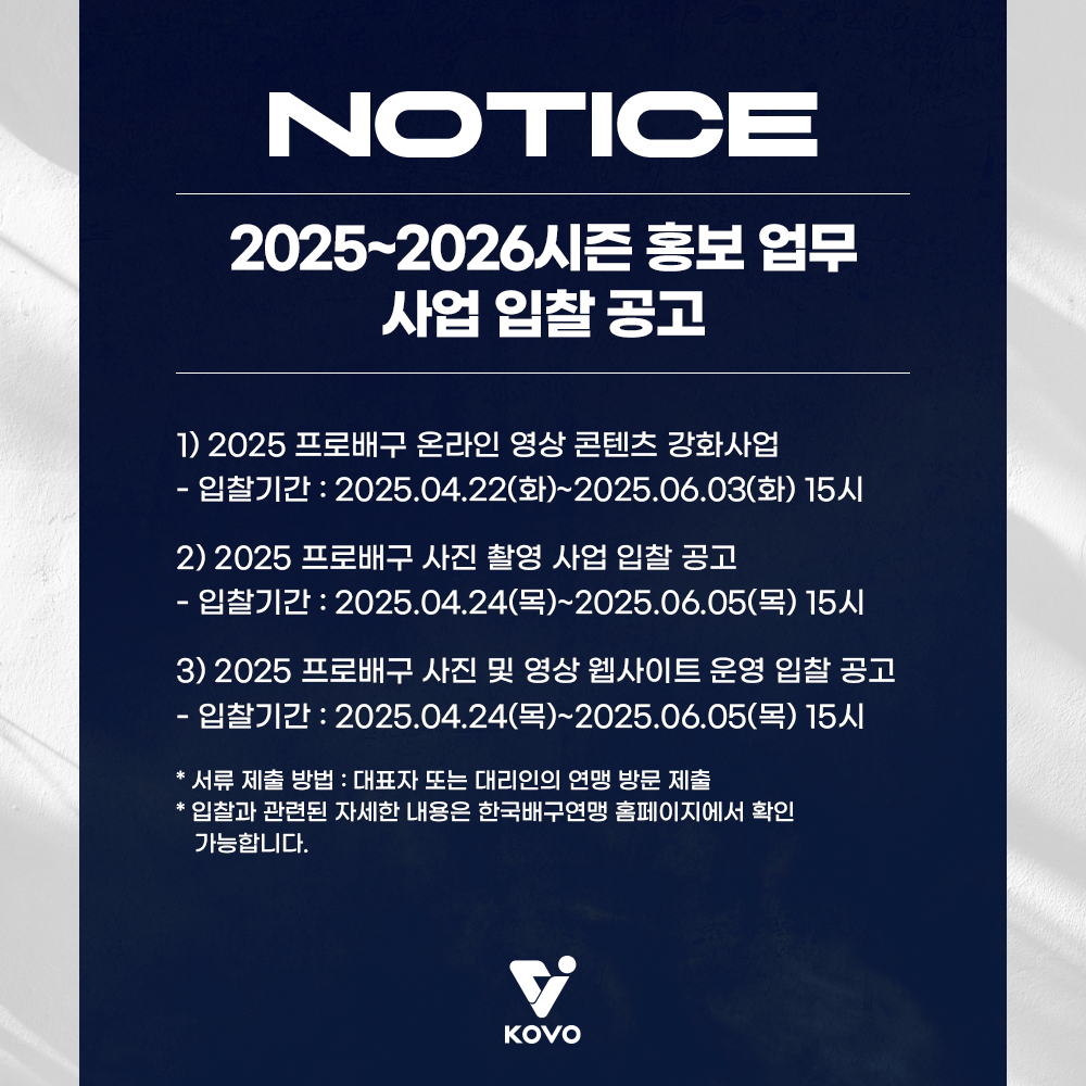 한국배구연맹이 2025~2026시즌 프로배구 SNS 채널 운영, 경기 및 행사 사진 촬영 및 아카이브 웹사이트 운영을 통해 함께 프로배구 홍보 업무를 함께할 운영사를 각각 모집한다.