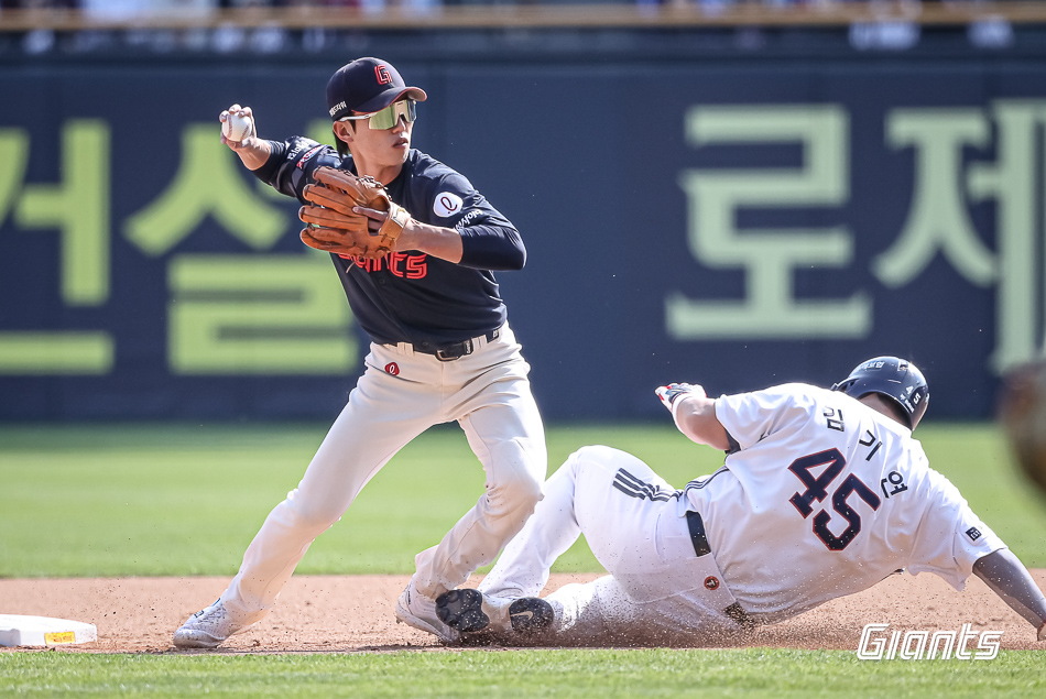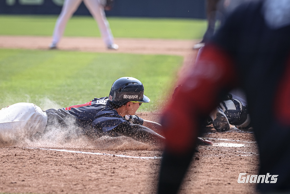 6회초 롯데가 한 점을 만회했다. 1사 후 윤동희가 좌중간을 가르는 2루타로 출루한 뒤 레이예스의 유격수 방면 깊은 내야 안타가 나오면서 1사 1, 3루가 됐다. 다음 타자는 나승엽. 풀카운트 끝에 6구째 헛스윙 삼진을 당하는 순간, 1루 주자 레이예스가 2루 도루를 감행했다. 곧장 김기연의 2루 송구가 이어졌고, 바로 이 순간 3루 주자 윤동희가 홈을 향해 질주했다. 이중 도루였다. 재차 홈으로 공이 뿌려졌으나 방향이 다소 빗나가면서 윤동희가 득점을 올릴 수 있었다.