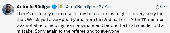 유럽 축구계가 비판으로 들끓자 뤼디거는 "행동에 대해 변명의 여지가 없다. 진심으로 사과드린다"며 "경기 종료 직전 실수를 했다. 심판을 비롯해 실망했을 분들께 다시 한번 사과드린다"라고 고개를 숙였다.