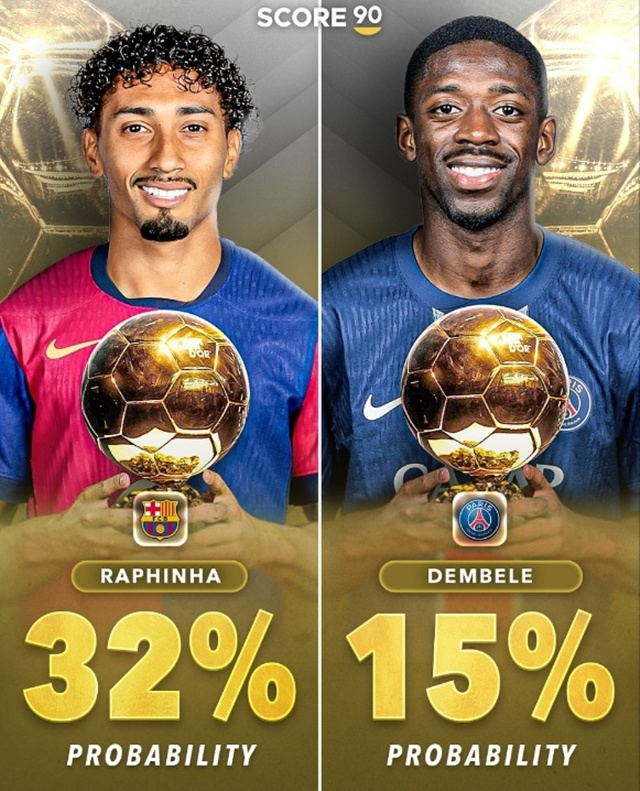 축구전문 433은 지난 25일(한국시간) 통계매체 북메이커의 자료를 빌려 2025년 발롱도르 수상 가능성이 높은 후보들을 공개했다. 가장 유력한 후보로는 스페인 바르셀로나 공격수 하피냐였다. 여러 후보들 가운데 '32%' 가장 높은 수상 확률을 기록했다.
