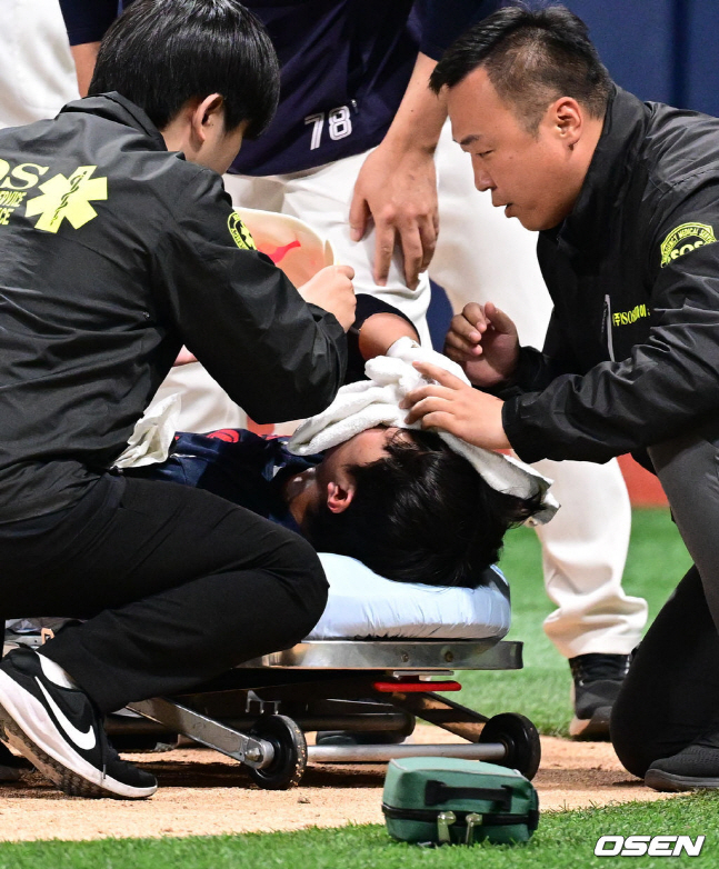 전민재는 쓰러져 몸을 움직이지 못했고 이내 앰뷸런스가 홈플레이트까지 들어왔다. 전민재는 들것에 실려 구급차에 몸을 실었고 인근 고려대학교 구로병원으로 이송돼 검진을 받을 예정이다. 다행스럽게도 최악의 상황은 피한 것으로 보인다. 롯데 구단 관계자는 "머리에 바로 맞은 건 아니고 헬멧에 맞은 뒤 맞은 것으로 보인다"고 설명했다.