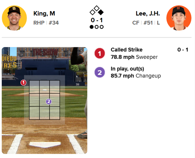 1회초 1사 1루에서 첫 타석에 등장한 이정후는 오심이라고 할 수 있는 볼 판정에 당했다. 샌디에이고 선발 마이클 킹이 던진 초구 스위퍼는 스트라이크존 바깥으로 들어왔지만, 필 쿠치 주심은 스트라이크를 선언했다. 이정후는 덤덤하게 임했지만, 결국 다음 공에 3루수 뜬공으로 물러나고 말았다.