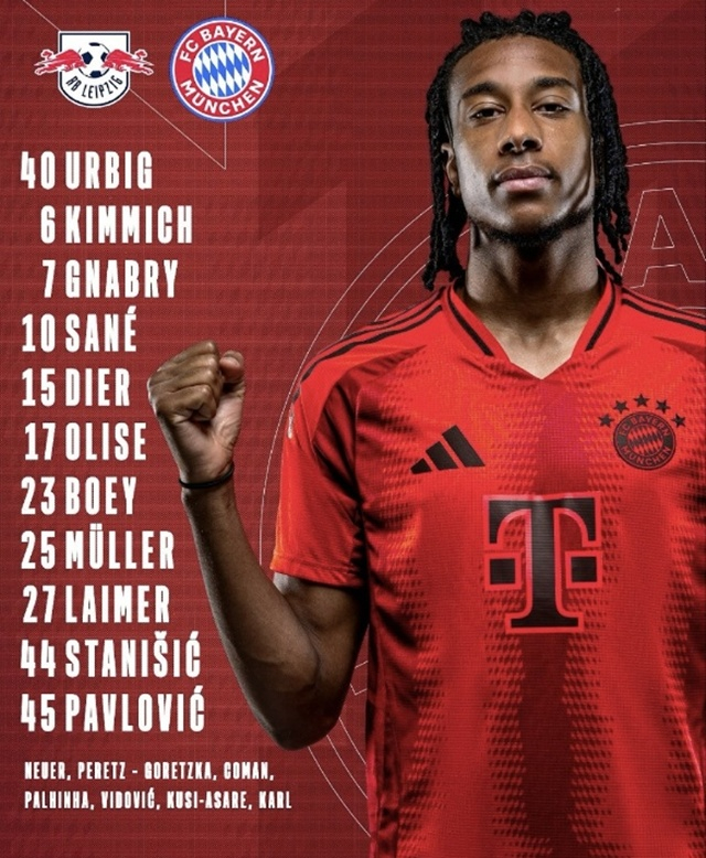 이에 뮌헨은 골키퍼 요나스 우르비히를 비롯해 콘라드 라이머, 요십 스타니시치, 다이어, 샤샤 보이, 요슈아 키미히, 알렉산다르 파블로비치, 마이클 올리세, 토마스 뮐러, 르로이 사네, 세르주 그나브리가 선발 명단에 이름을 올렸다.