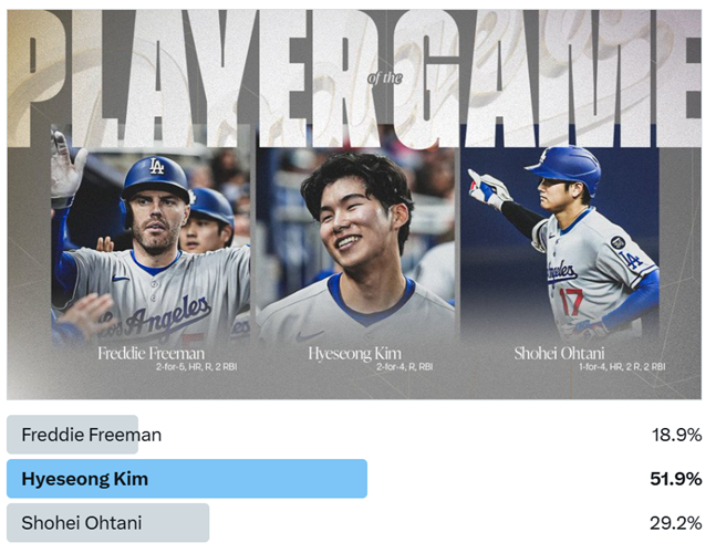 그런데 경기 종료 후 다저스 공식 X(구 트위터)에서 진행한 '오늘의 수훈선수' 투표에서는 프리먼도, 오타니도 아닌 선수가 팬들의 선택을 독차지했다. 바로 김혜성이었다. 총 2만 6218명이 참여한 투표에서 김혜성은 51.9%의 지지를 받아 오타니(29.2%)와 프리먼(18.9%)을 제쳤다.