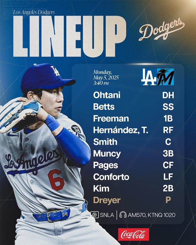 다저스는 6일(한국시간) 미국 플로리다주 마이애미의 론디포 파크에서 열린 마이애미 말린스와 2025 메이저리그 정규시즌 원정경기에서 7-4로 승리했다. 시즌 전적 24승 11패가 된 다저스는 내셔널리그 서부지구 선두를 지키고 있다.