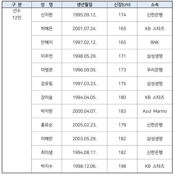 최종 명단에는 해외파 박지현(Azul Marino)과 최근 KB로 복귀를 알린 박지수를 비롯하여 강이슬 허예은(이상 KB), 신지현(신한은행), 이해란(삼성생명), 안혜지(BNK) 등 꾸준히 대표팀에 소집되었던 선수들이 대거 포함됐다.