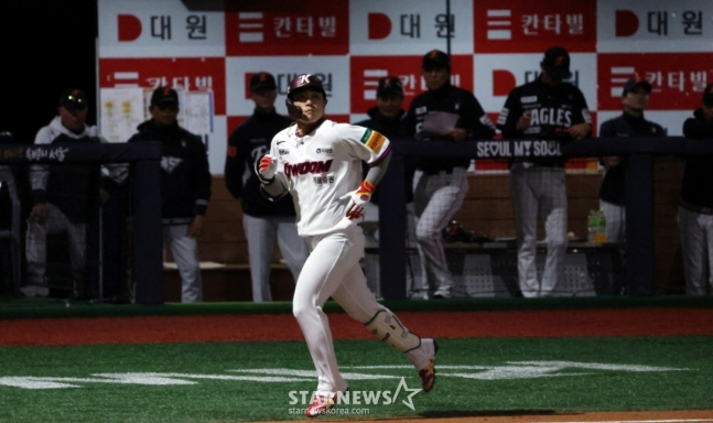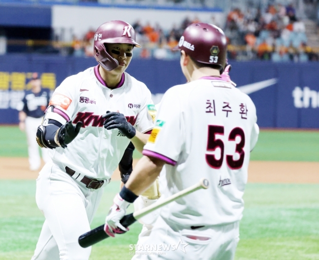 이날 1군으로 복귀한 이주형도 자축포를 날렸다. 1회말 1사 주자 없는 2B1S 볼카운트에서 낮게 떨어지는 시속 132㎞ 체인지업을 걷어 올려 우측 담장을 넘겼다. 비거리 125m의 시즌 3호포.