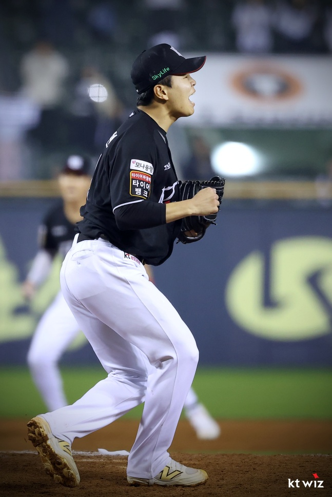 원상현은 손동현보다 3살 어리다. 가산초(부산진구리틀)-개성중-부산고 졸업한 그는 2024 KBO 신인드래프트 1라운드 7순위로 KT에 지명돼 올해로 프로 2년 차를 맞았다. 지난해 22경기 2승 5패 1홀드 평균자책점 7.03으로 굴곡 있는 데뷔 시즌을 보낸 원상현은 손동현을 비롯한 KT 선배들을 따라 프로다운 루틴과 마음가짐을 가지게 되면서 한층 성장한 모습이다. 올해 19경기 0승 1패 5홀드 평균자책점 2.11, 21⅓이닝 20탈삼진으로 김민수-원상현-손동현-박영현으로 이어지는 필승조의 일원이 됐다.