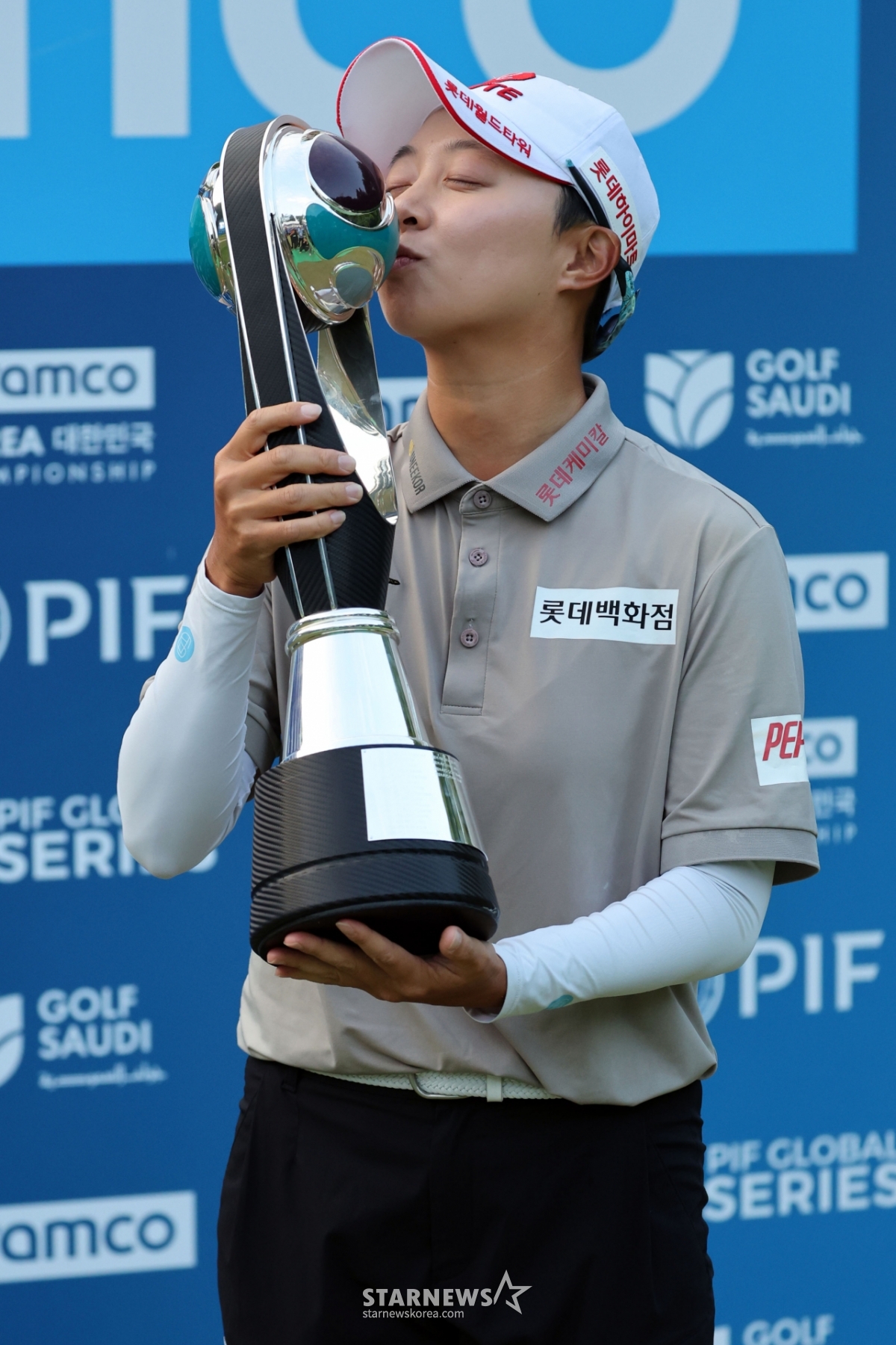 김효주 선수가 11일 오전 경기 고양시 뉴코리아CC에서 열린 아람코 코리아 챔피언십(Aramco Korea Championship)은 마지막날 경기에서 3언더파 합계 7언더파로 우승을 하고 세리머니를 하고 있다. 2025.05.11