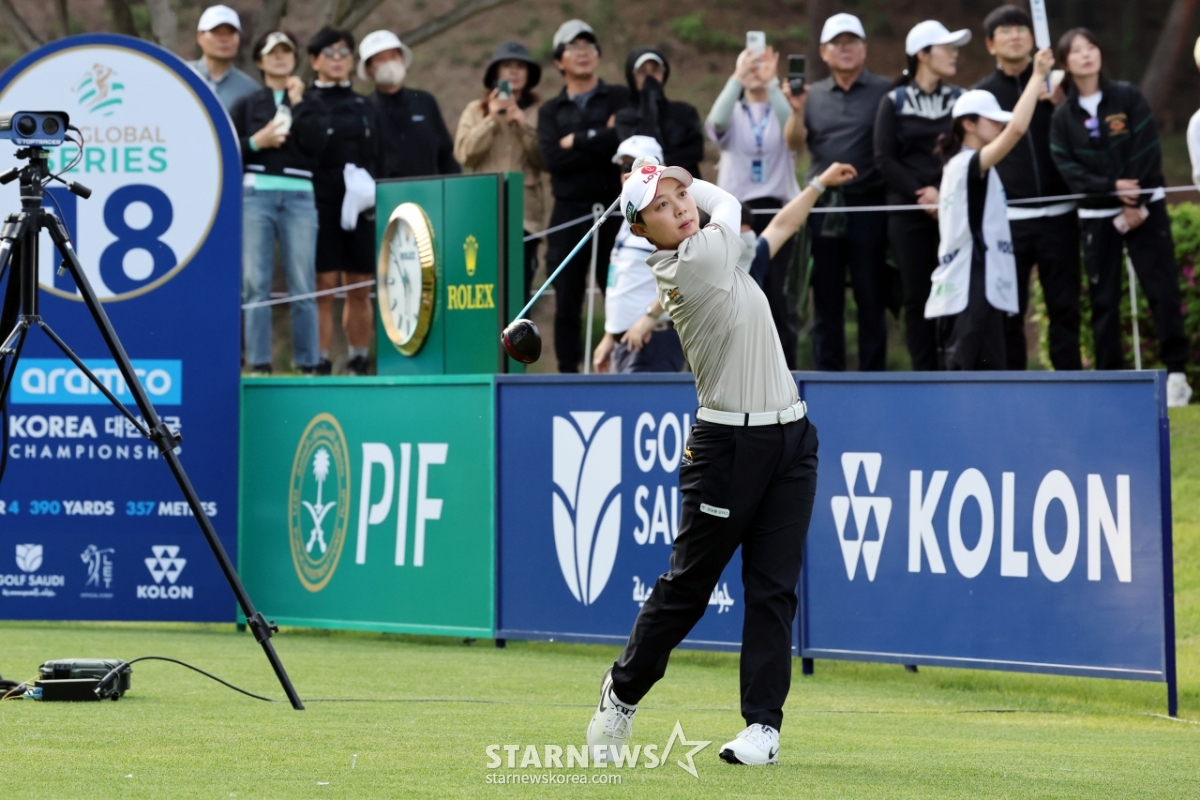 김효주 선수가 11일 오전 경기 고양시 뉴코리아CC에서 열린 아람코 코리아 챔피언십(Aramco Korea Championship)은 마지막날 경기 18번 홀 티샷을 하고 있다.2025.05.11
