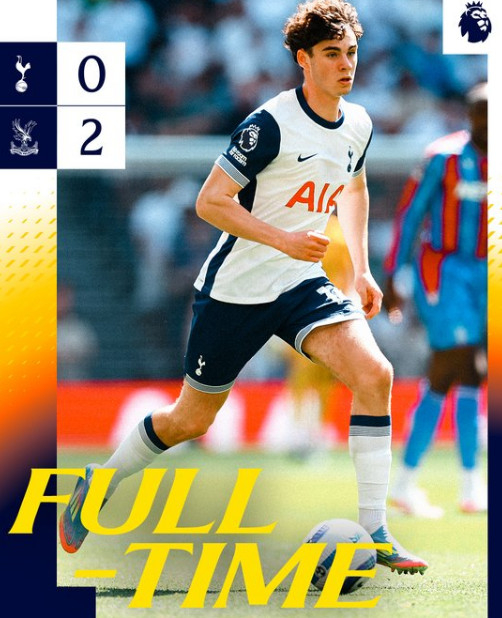 토트넘은 지난 11일(한국시간) 영국 런던의 토트넘 홋스퍼 스타디움에서 열린 크리스탈 팰리스와 '2024~2025시즌 잉글리시 프리미어리그(EPL)' 36라운드 홈 경기에서 0-2로 패했다.
