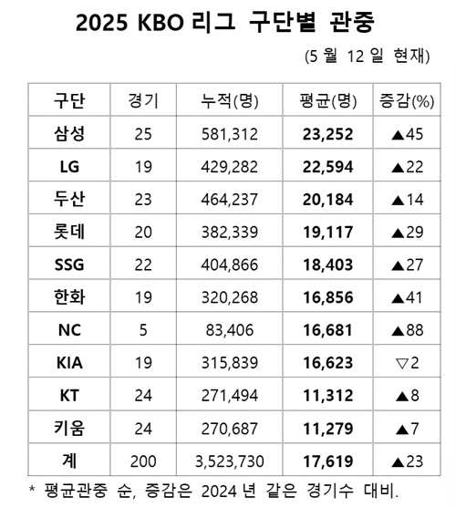 이날까지 정규시즌의 27.8%(200경기)를 소화한 가운데 누적 관중은 352만 3730명이다. 지난해 같은 경기수(287만 1046명) 대비 22.7% 증가했다. 경기당 평균 관중은 1만 7619명으로 지난 해 1만 4355명보다 3200여 명 늘었다. 이런 추세라면 올 시즌 예상 최종(720경기) 관중 수는 지난해 1088만 7705명을 넘어 산술적으로 1268만 5428명에 달한다.