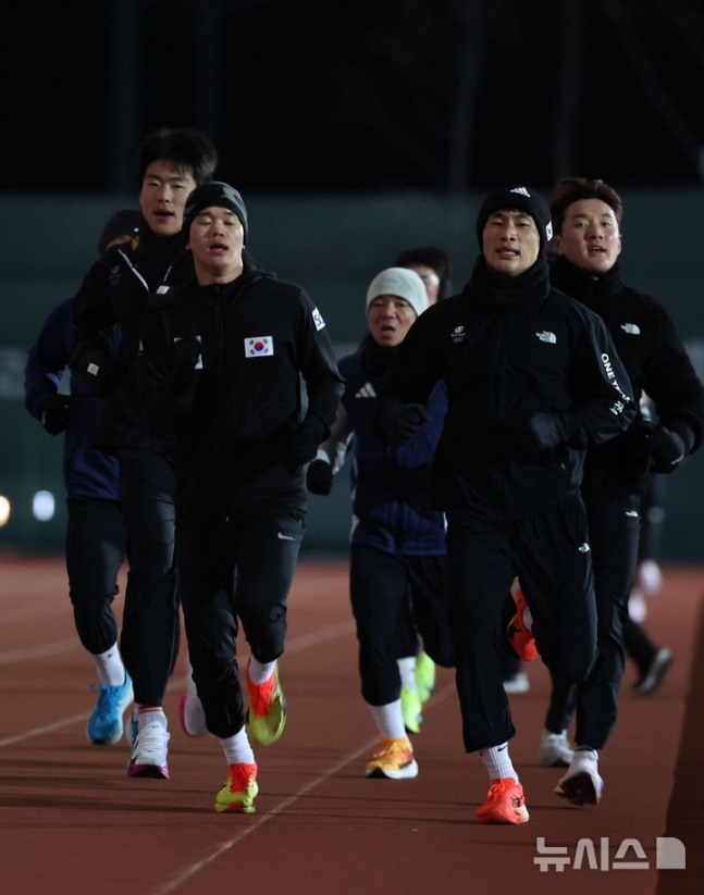 충북 진천국가대표선수촌에서 국가대표 선수들이 신년 훈련 새벽 구보를 하고 있다. /사진=뉴시스