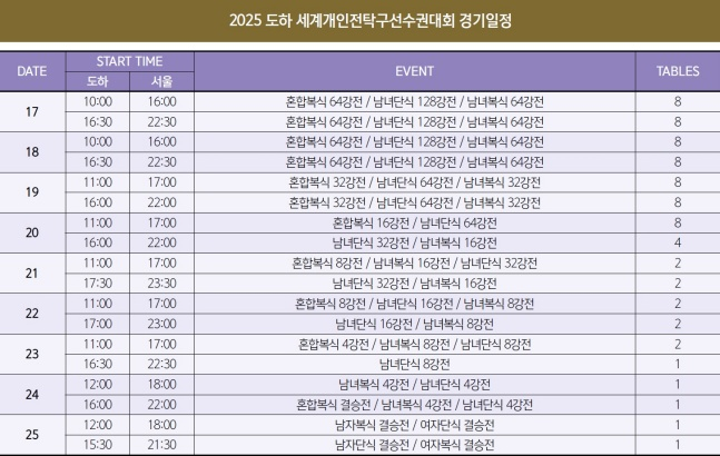 국제탁구연맹(ITTF)은 세계선수권대회를 단체전과 개인전으로 나눠 매년 연다. 지난해 우리나라 부산에서 단체전이 열렸고, 이번에는 개인전 차례다. 직전 개인전 대회는 2023년 남아공 더반 대회였다.