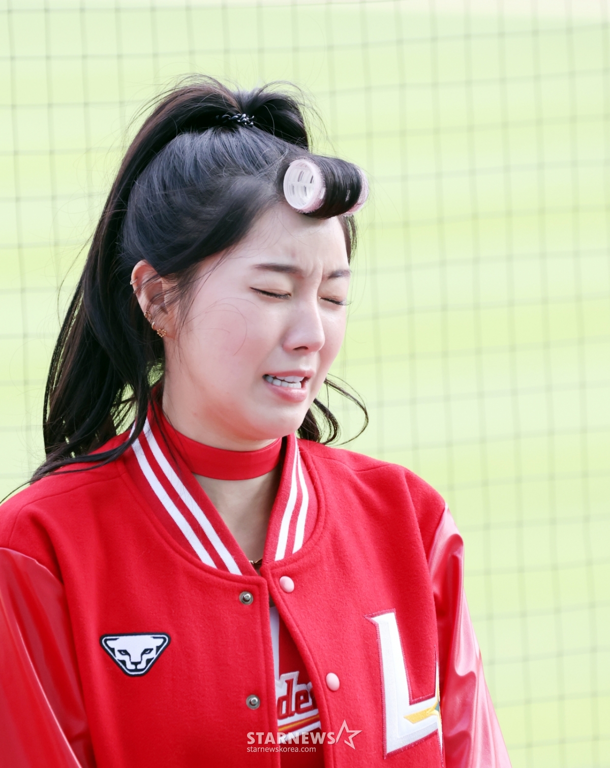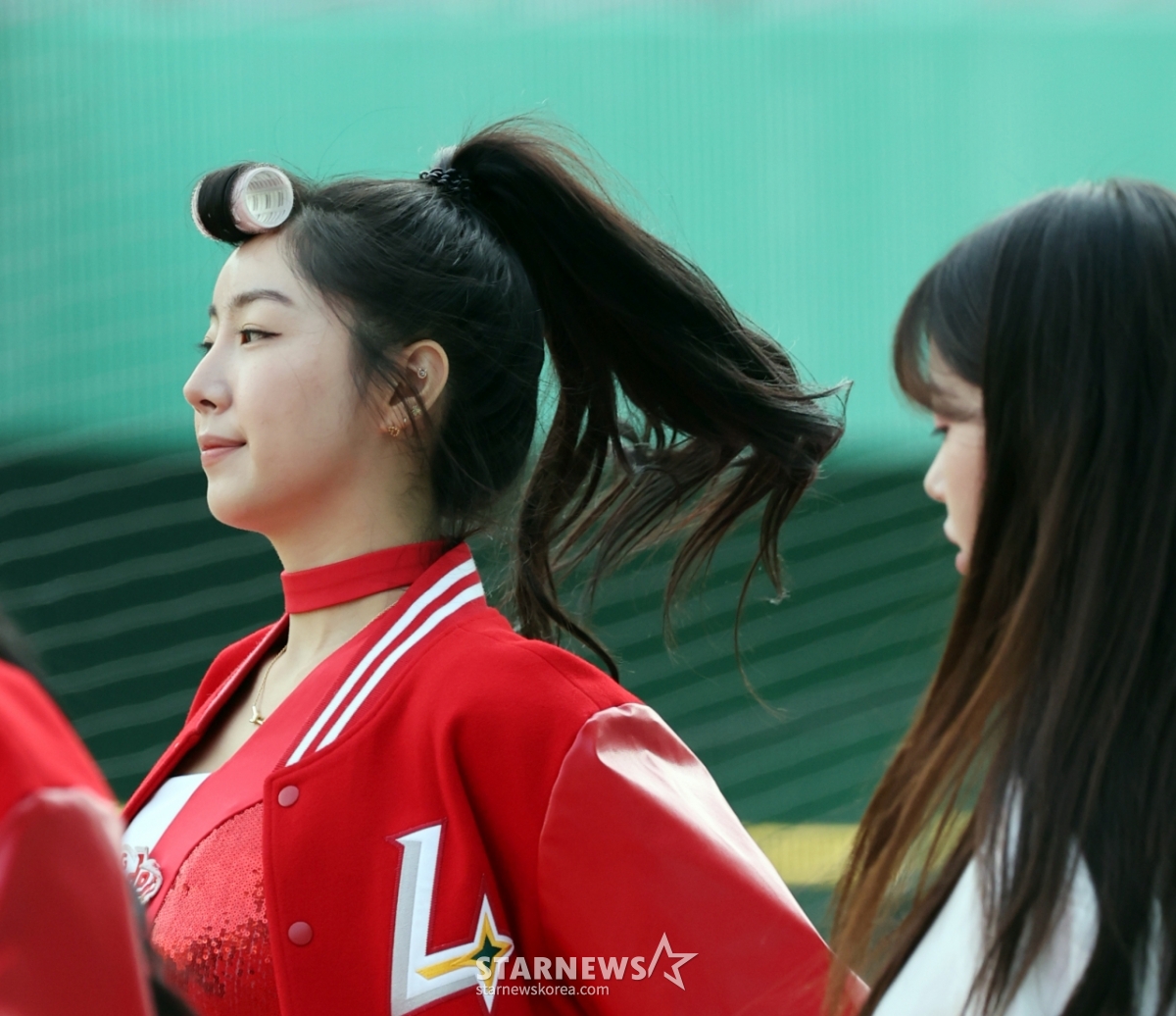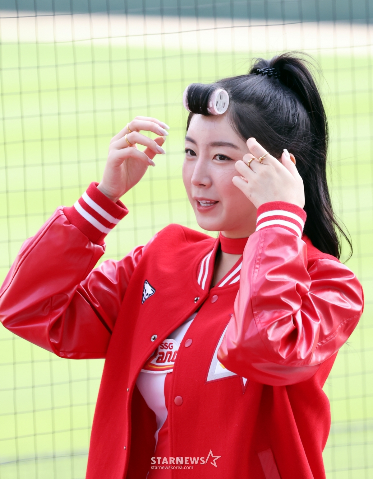 SSG치어리더 안지현이 14일 인천SSG랜더스필드에서 열리는 2025프로야구 NC다이노스와 SSG랜더스 경기에 앞서 앞머리에 롤을 한채 연습에 열중하고 있다.