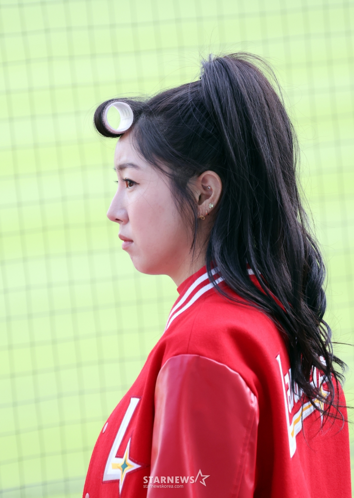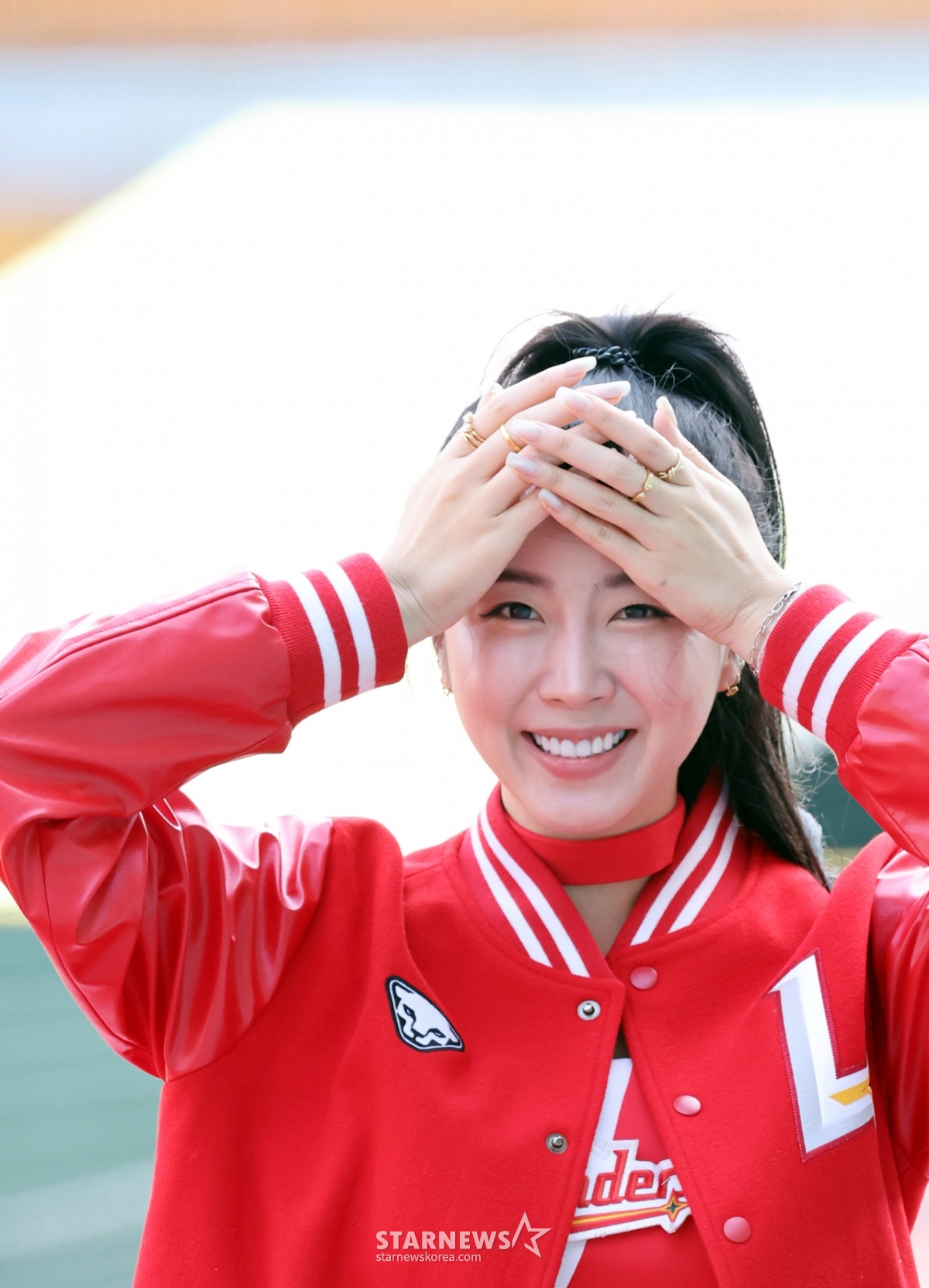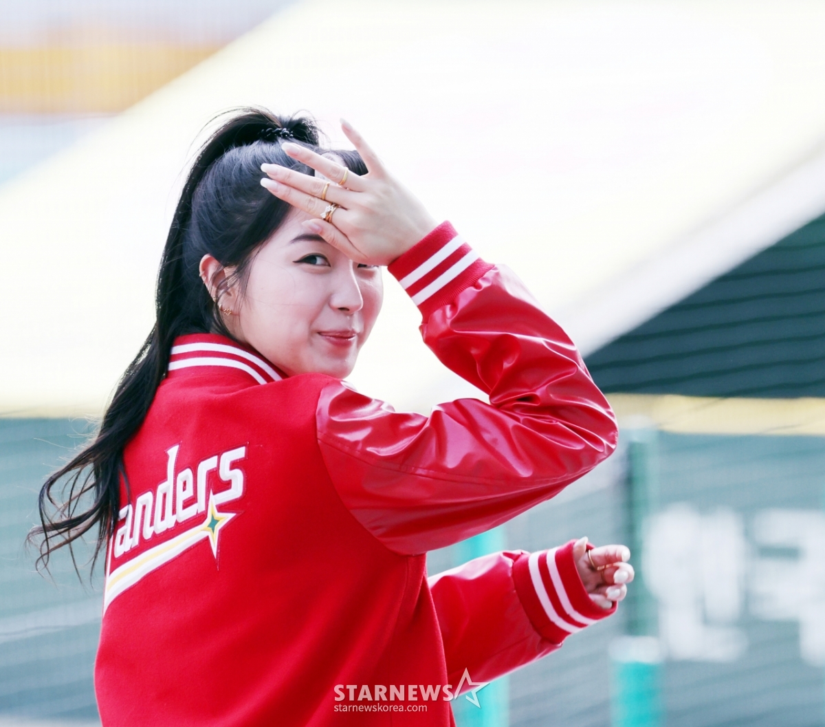 SSG치어리더 안지현이 14일 인천SSG랜더스필드에서 열리는 2025프로야구 NC다이노스와 SSG랜더스 경기에 앞서 앞머리에 롤을 한채 연습에 열중하고 있다.