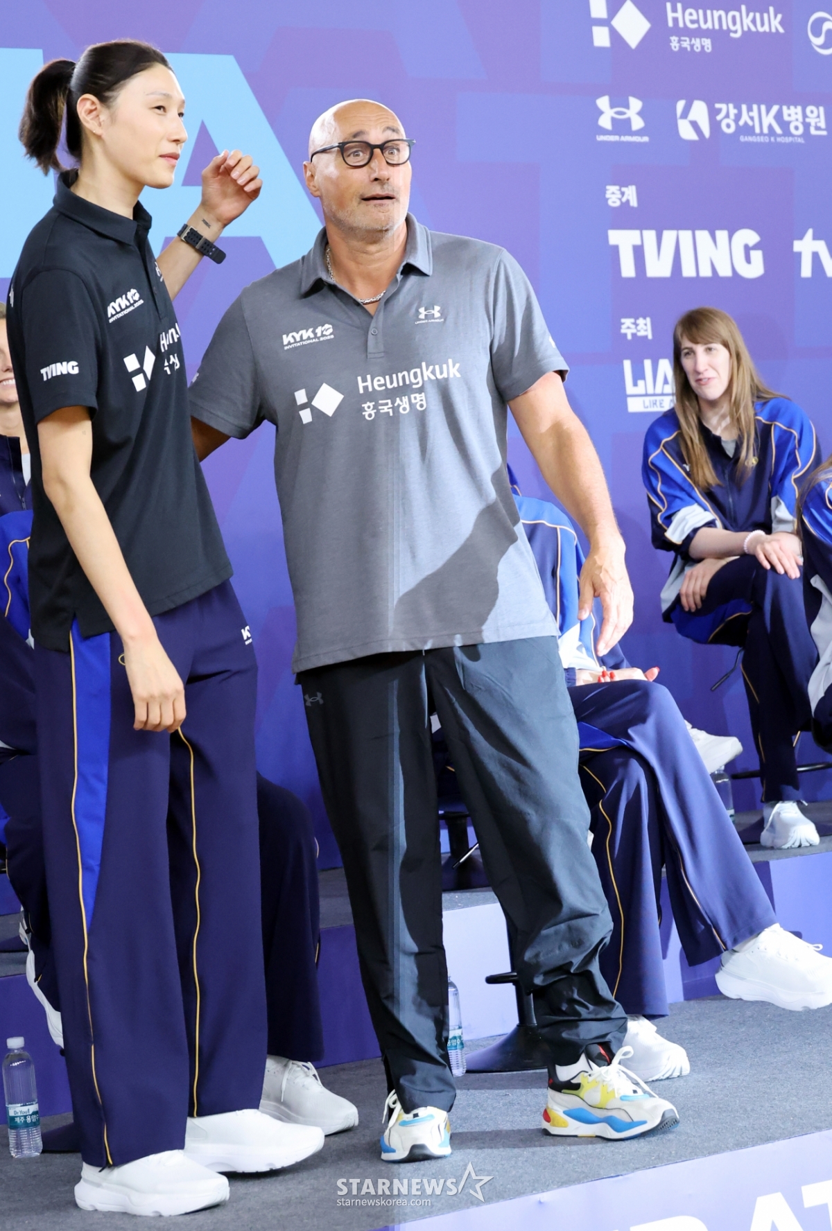 김연경이 공동기자회견에 앞서 아본단자감독과 미디어데이 포토타임을 갖고 있다. '제2회 김연경 인비테이셔널(KYK INVITATIONAL 2025)'은 김연경이 자신의 이름을 건 이벤트 경기로 미디어데이가 16일 인천 삼산월드체육관에서 열렸다.