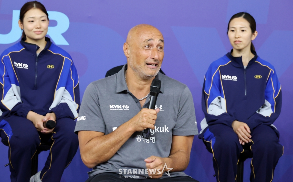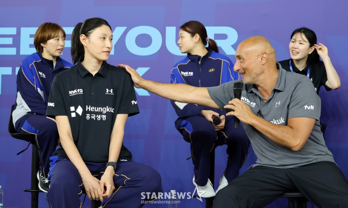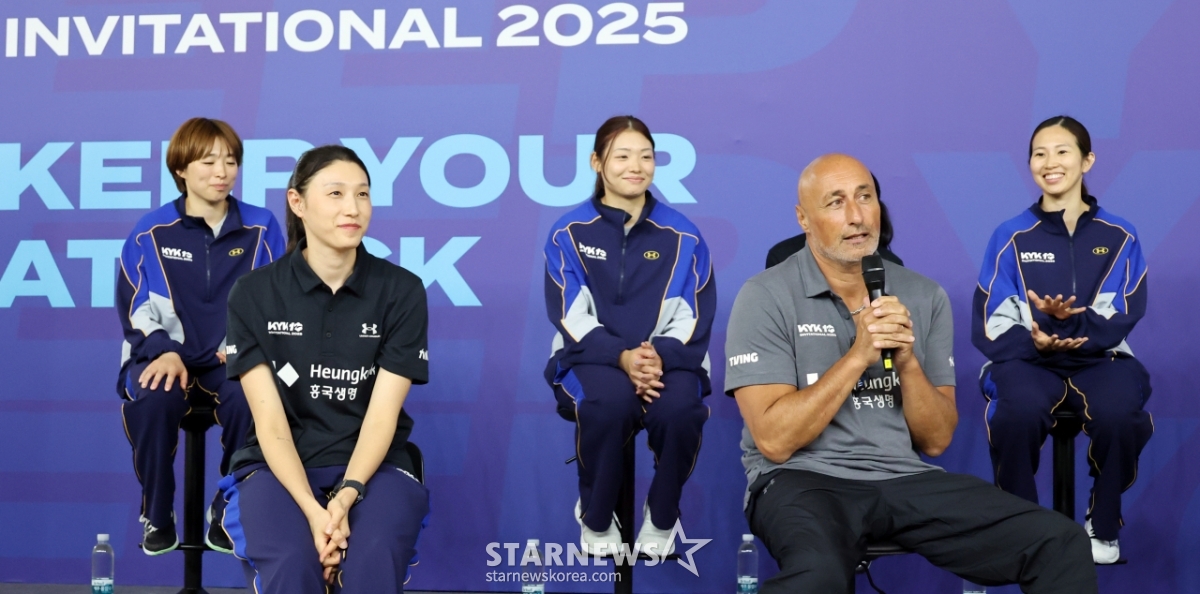 김연경과 아본다자 감독이 공동기자회견에서 기자들의 질문에 답하고 있다. '제2회 김연경 인비테이셔널(KYK INVITATIONAL 2025)'은 김연경이 자신의 이름을 건 이벤트 경기로 미디어데이가 16일 인천 삼산월드체육관에서 열렸다.