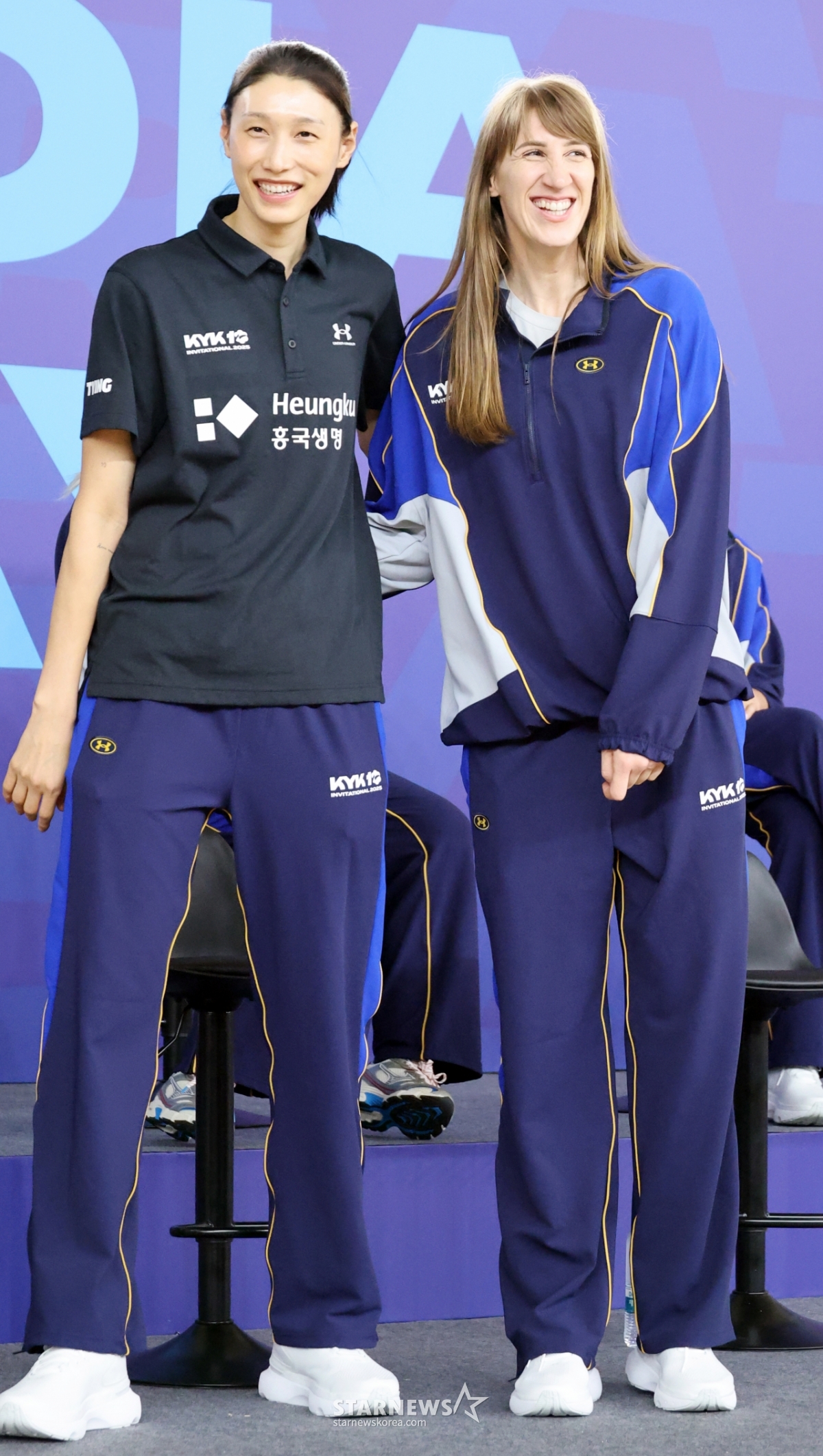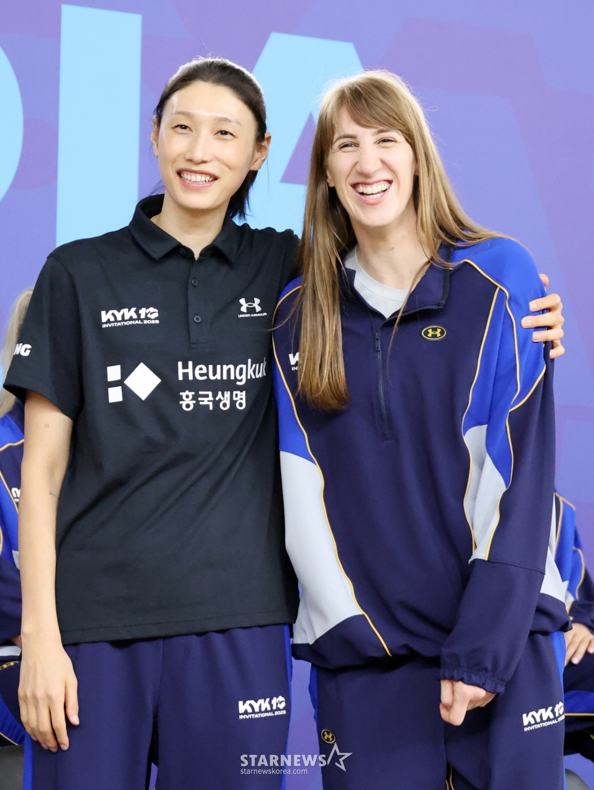 김연경이 미디어데이 공동기자회견에 앞서 참가한 세계 올스타 세르비아 브란키차 미하일로비치와 기념촬영을 하고 있다. '제2회 김연경 인비테이셔널(KYK INVITATIONAL 2025)'은 김연경이 자신의 이름을 건 이벤트 경기로 미디어데이가 16일 인천 삼산월드체육관에서 열렸다.