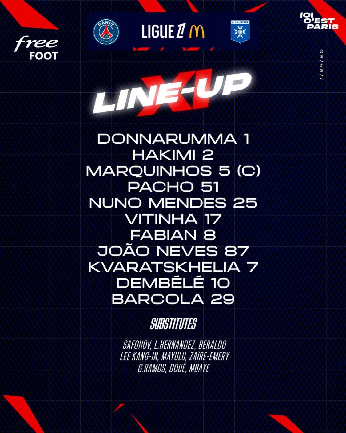 이날 PSG는 우스만 뎀벨레를 중심으로 브래들리 바르콜라와 흐비차 크바라츠헬리아가 양 측면에 서는 4-3-3 전형을 가동했다.