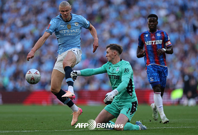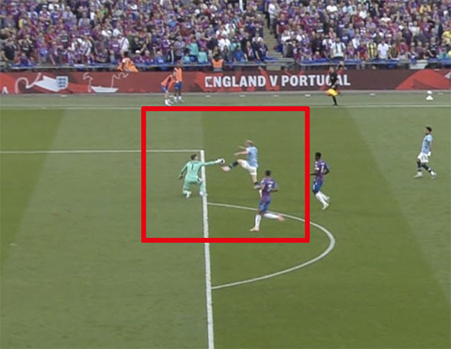 0-1로 뒤지고 있던 맨시티가 수비 지역 롱패스로 역습을 전개했다. 엘링 홀란(맨시티)이 수비 뒷공간을 파고든 뒤 골키퍼와 맞선 장면. 골문을 비우고 나온 골키퍼 헨더슨이 급하게 손으로 공을 쳐냈다.