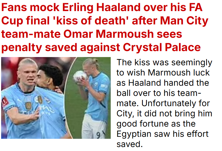 더불어 홀란이 페널티킥을 직접 차지 않은 이유로는 "홀란은 웸블리 스타디움에서 페널티킥을 차는 게 너무 버거웠을 것이다. 그도 인간이다"라고 추측했다.