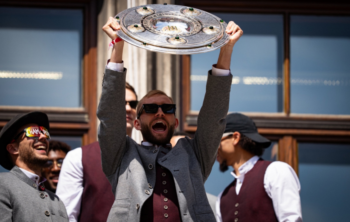 뮌헨은 18일(한국시간) 독일 뮌헨의 마리엔 광장에서 2024~2025시즌 분데스리가 우승 기념 행사를 진행했다. 나란히 우승에 성공한 남녀팀 선수단은 1만 5000여명 팬들 앞에서 트로피를 들어 올리며 기쁨을 만끽했다.