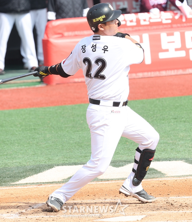 결국 KT가 5회말 3득점을 올리며 5-0까지 도망갔다. 선두타자 황재균이 좌전 안타로 출루한 뒤 김민혁이 1루수 번트 플라이 아웃으로 물러났다. 여기서 KIA는 윤영철을 내리고 윤중현을 올렸다. 안현민은 3루수 직선타 아웃. 2아웃을 채웠으나 황재균의 큰 것 한 방이 기다리고 있었다. 다음 타석에 들어선 장성우는 윤중현의 초구 141km 높은 보더 라인에 걸친 속구를 받아쳐 좌측 담장을 넘어가는 투런포를 작렬시켰다. 장성우의 시즌 5호 홈런. 비거리는 108.3m였다.
