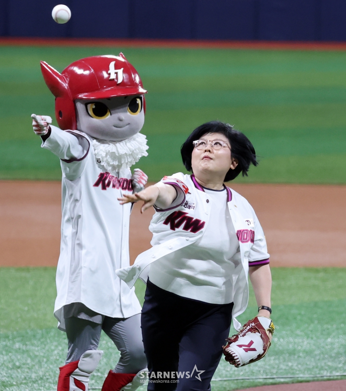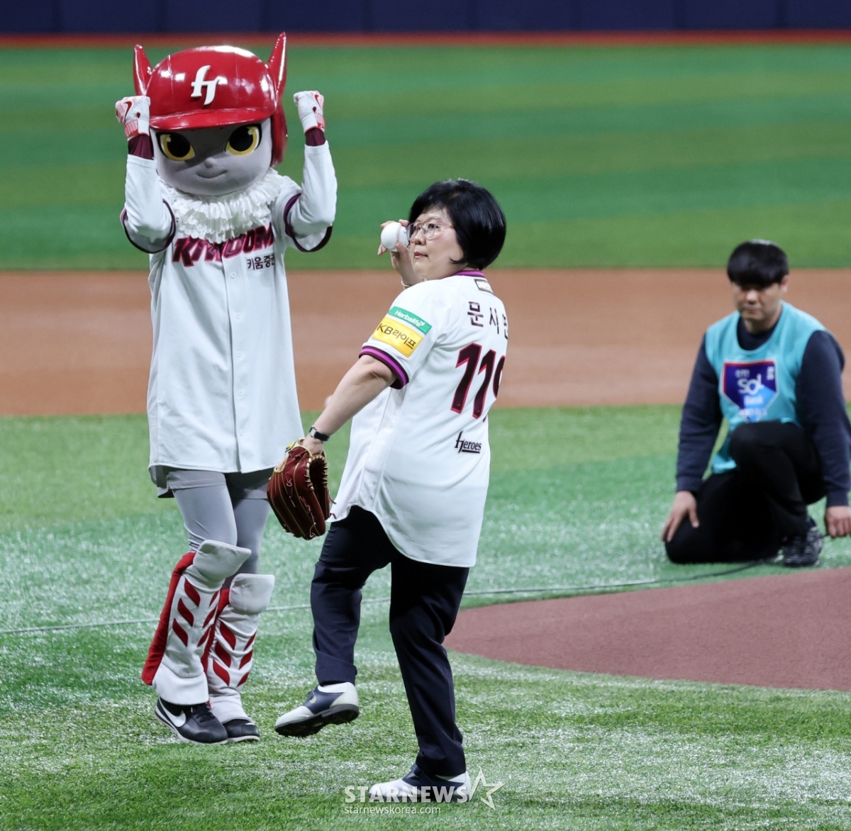 숙명여대 문시연 총장이 20일 고척스카이돔에서 열린 2025KBO리그 키움히어로즈와 삼성라이온즈의 경기에 앞서 시구를 하고 있다. 시타에는 숙명여대 캐릭터 눈송이가 맡았다. 키움히어로즈는 '숙명여자대학교데이'를 맞아 숙명여대 학생 및 교직원 약 300여명 고척돔을 찾았다고 전했다. 2025.05.20.