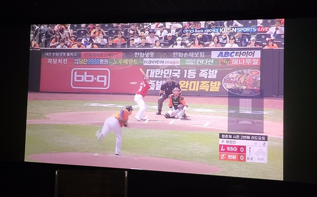 필자는 지난 18일 일요일 오후 2시 지인과 함께 CGV인천을 찾았다. KBO리그 극장 생중계를 관람하기 위해서였다. 경기는 SSG 랜더스와 한화 이글스의 대전 경기였는데 대전한화생명볼파크도 1만 7000석이 매진됐고 CGV인천의 상영관 역시 103석이 만석이었다.