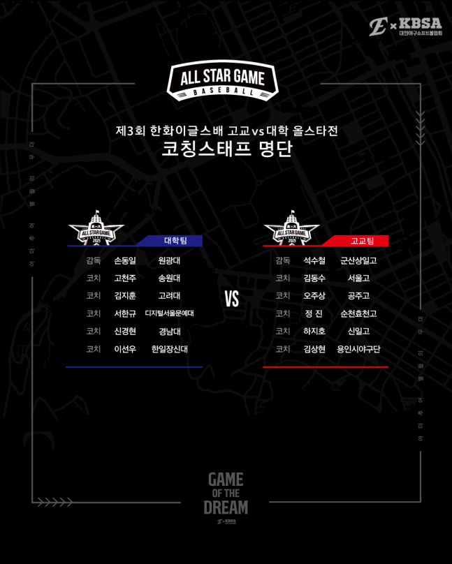 올해로 3회째를 맞는 한화이글스배 고교vs대학 올스타전은 한화 구단과 KBSA가 공동으로 주최하는 이벤트 경기다. 지난 2년 동안 아마추어 야구의 발전과 고교·대학 선수 간 교류에 크게 기여했다는 평가를 받고 있다.