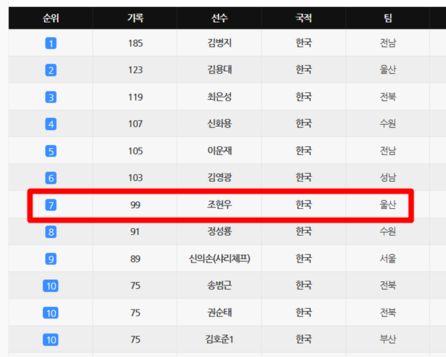 조현우는 1983년 프로축구 출범 이래 42년간 역대 K리그1 클린시트 부문에서 7위에 올라 있고, 현역 선수로는 선두를 달리고 있다. 이 부문 역대 1위는 김병지(은퇴)의 185회이다. 현역 선수 2위는 송범근(28·전북 현대)의 75회로 조현우와 격차가 크다.
