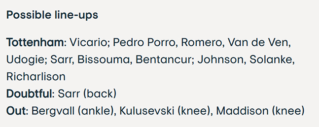 - 토트넘 : 비카리오(GK) – 페드로 포로, 로메로, 판더펜, 우도기 – 사르, 비수마, 벤탄쿠르 – 존슨, 솔란케, 히샬리송
