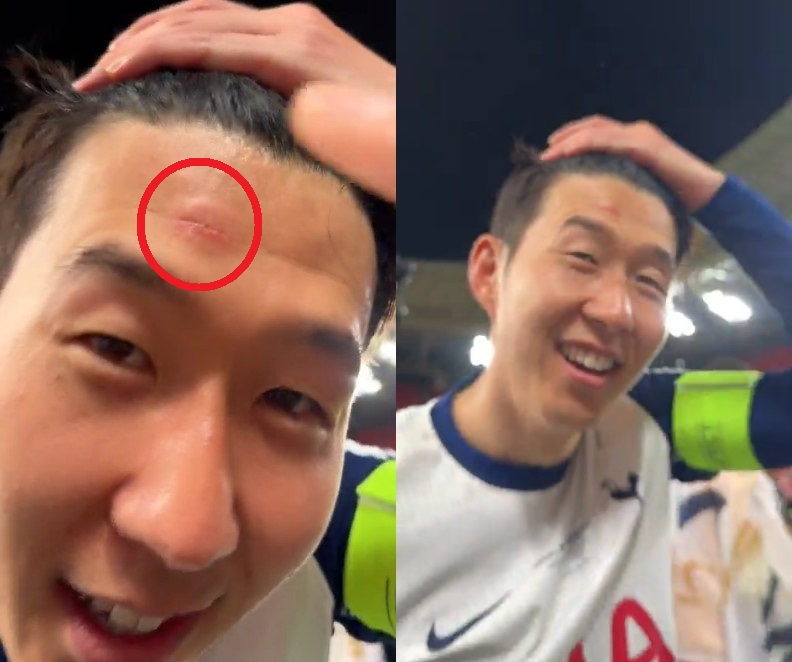 토트넘 캡틴 손흥민(33)이 우승컵 세리머니 도중 이마에 상처가 났다.