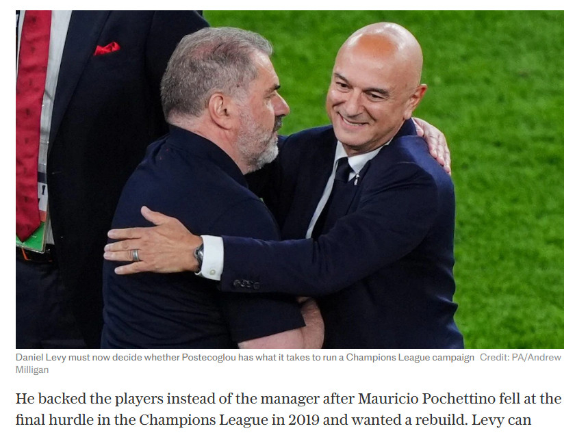 이어 "지금은 감독을 경질할 때가 아니다. 다 갈아엎을 시기도 아니다"라며 "UEL에서 우승한 포스테코글루 감독을 레비 회장이 지켜줘야 한다"고 강조했다.