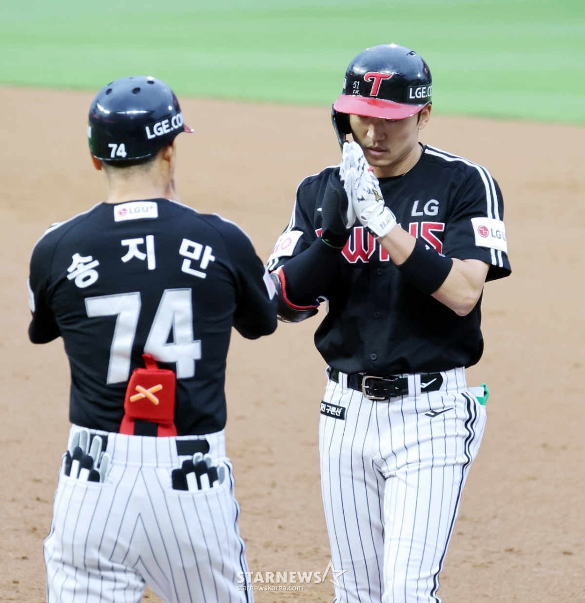 LG 박해민이 23일 인천SSG랜더스필드에서 열린 2025 KBO리그 SSG랜더스와 LG트윈스 경기 3회초 안타로 출루한 후 합장하는 포즈로 송지만 코치의 축하를 받고 있다. 2025.05.23.