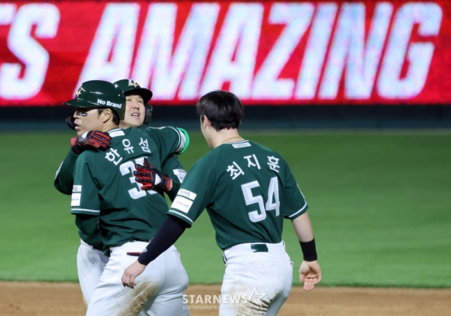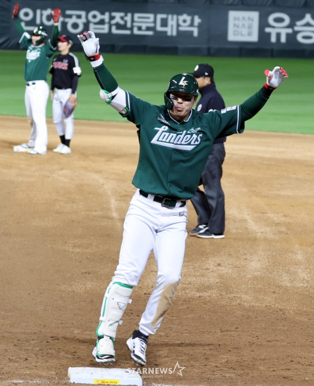 한유섬은 참지 않았다. 1구를 지켜본 한유섬은 김진성의 2구 바깥쪽 보더라인에 걸치는 속구를 결대로 밀어쳐 2루 주자 오태곤을 불러들였다. 끝내기 안타.