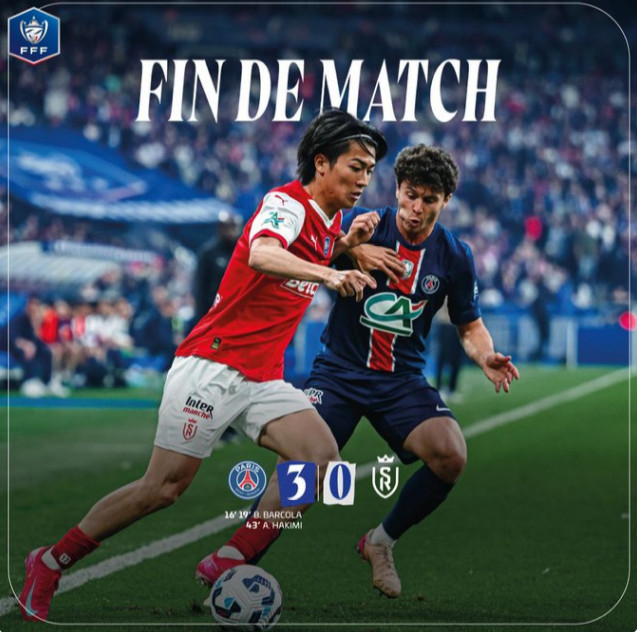 PSG는 25일(한국시간) 프랑스 생드니의 스타드 드 프랑스에서 열린 스타드 드 랭스와 '2024~2025시즌 쿠프 드 프랑스(프랑스컵)' 결승에서 브래들리 바르콜라의 멀티골과 아치라프 하키미의 쐐기골을 앞세워 3-0으로 승리했다.