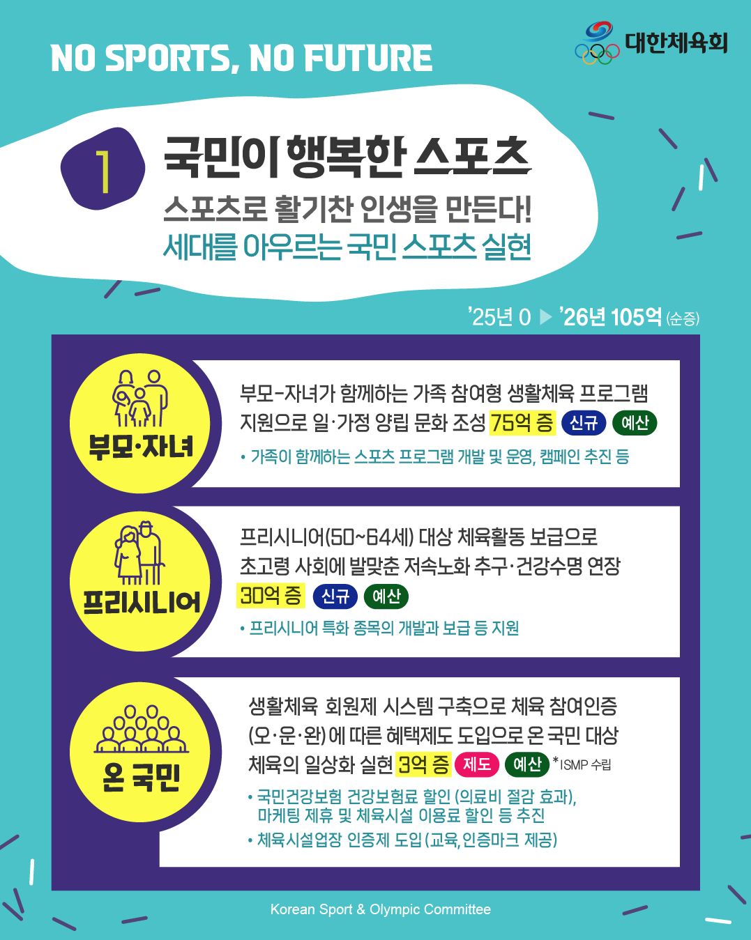 대한체육회의 이번 제안은 'NO SPORTS, NO FUTURE(체육 없는 미래는 없다)'라는 슬로건을 통해, 체육이 국민의 삶의 질을 높이고 국가의 지속가능한 성장을 이끄는 핵심 공공정책임을 강조하고자 한다. 체육은 단순한 경기력 향상이나 이벤트 중심의 산업을 넘어, 건강, 교육, 경제, 그리고 지역 균형 발전에 이르기까지 사회 전반에 전략적 영향을 미치는 중요한 자산이다.